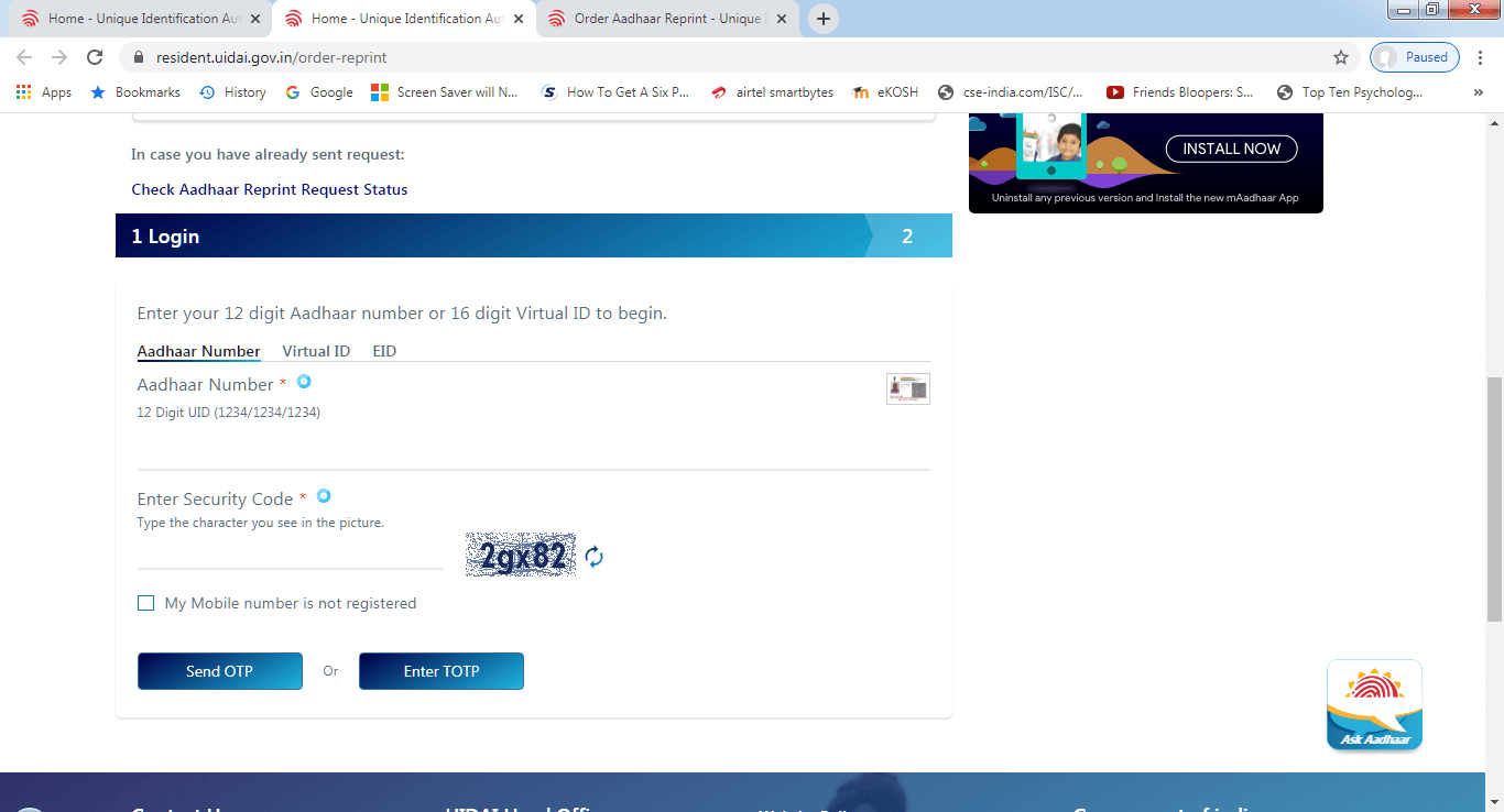 The mAadhaar application also allows you to raise a reprinting request for your Aadhaar card. The process is as follows –
