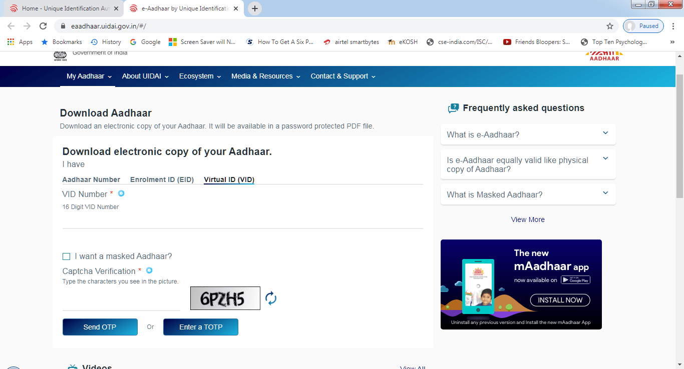 - You would be given three choices for the download – through Aadhaar number, Virtual ID (VID) number and Enrolment ID number