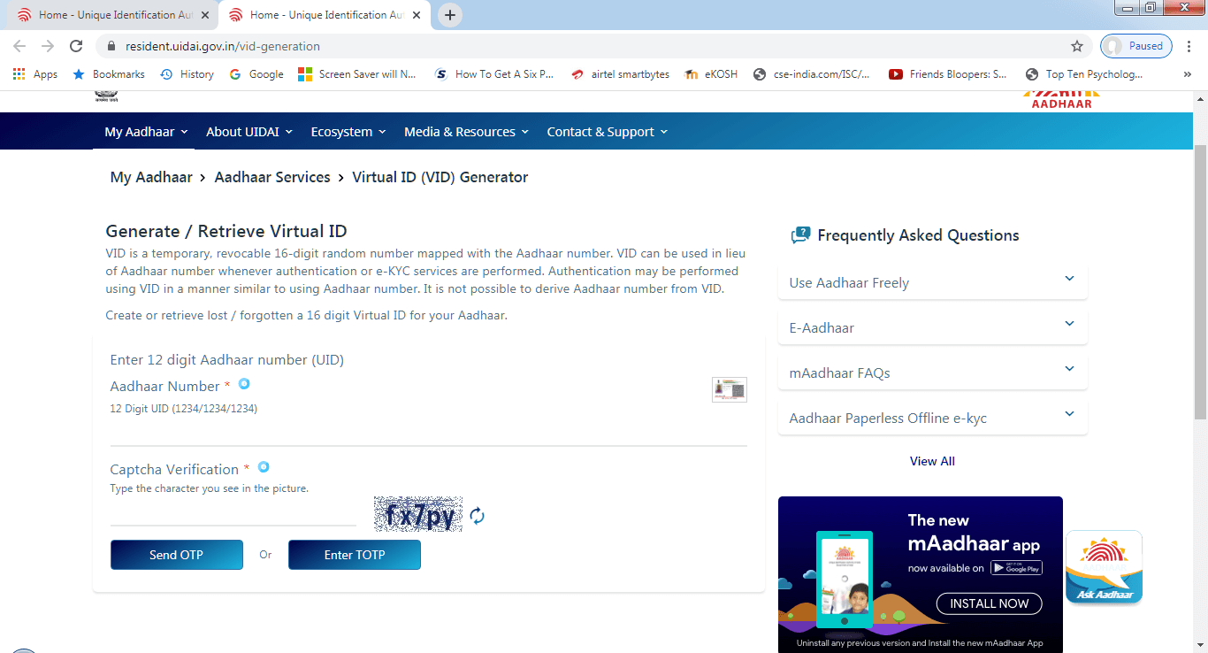 - If you choose the ‘Virtual ID Number’ option, enter the 16-digit virtual ID number, captcha code and then request for OTP. The OTP would be sent to the registered mobile number which you need to enter to download Aadhaar. If you don’t have a VID, you can generate one through the application itself. For generating a VID, open the application and choose the option ‘Virtual ID Generator’. In the next page enter in your 12-digit Aadhaar card number followed by the captcha code and request for an OTP. Enter the OTP that you receive on the registered mobile number and a 16-digit Virtual ID number would be generated. You can use this VID to download the Aadhaar card.