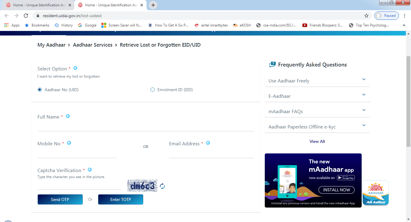 - Then choose whether you want to retrieve your Aadhaar Number (UID) or your Enrolment ID Number (EID).