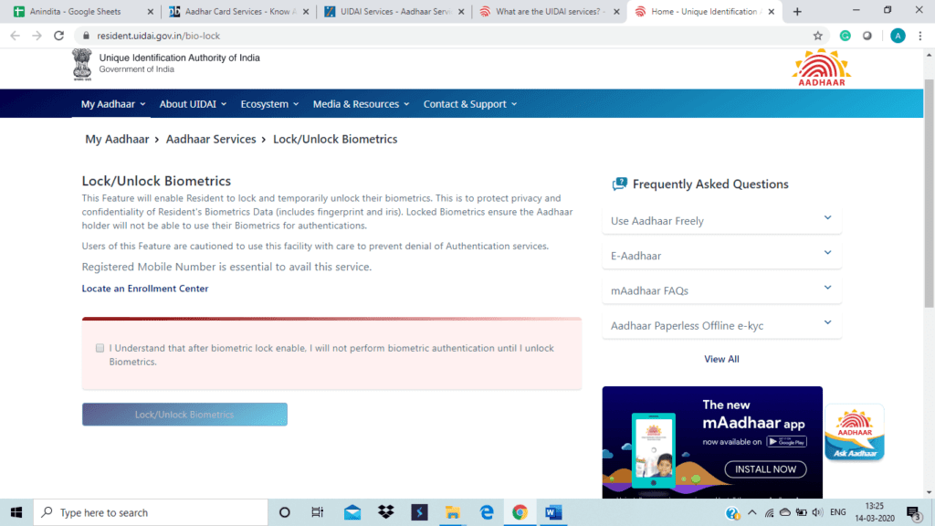 - Lock or Unlock Biometrics: Through aadhaar website you may secure your biometric authentication by locking your biometrics. After you lock the same, no one else can use it for any kind of authentication. You may unlock your biometrics before any essential transaction for biometric authentications. Follow the below steps for this: