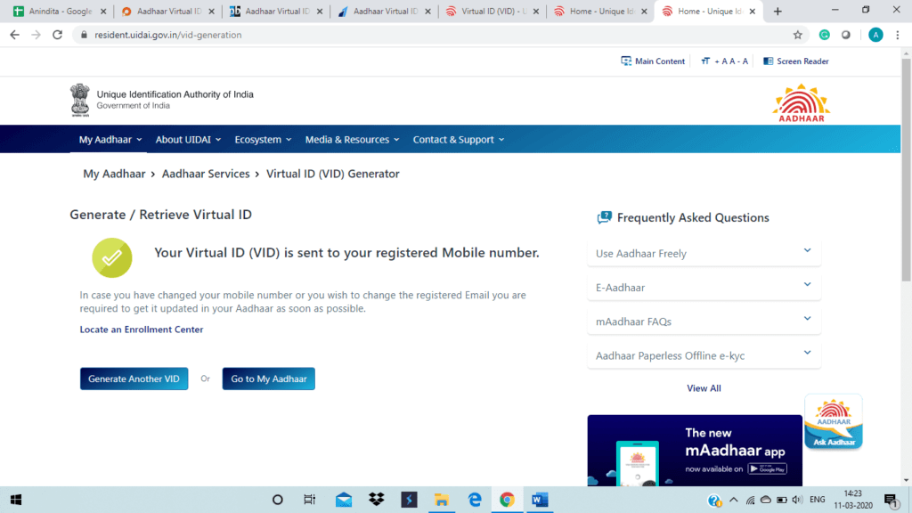 - Step 5: Virtual ID will be generated and a message like below will appear and this will be the 16-digit ID that you will receive in your registered mobile number stating virtual ID for Aadhaar number and the last 4 digits of your Aadhaar, generated at DD MM YYYY: HH: MM: SS format
