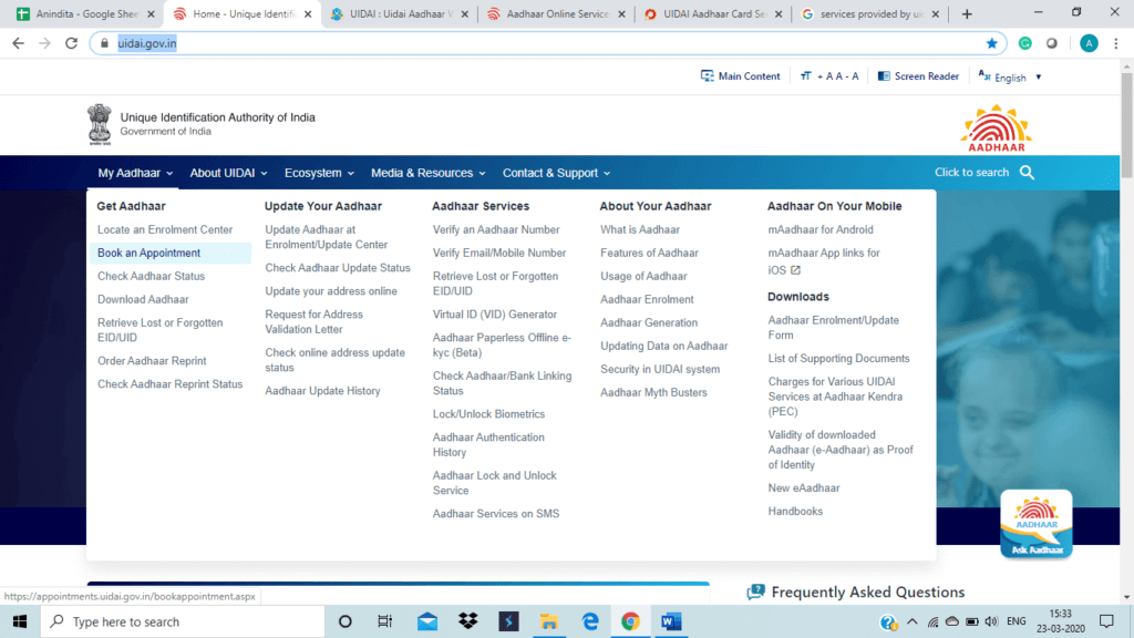 - Locating an Enrolment Centre and booking appointment: Aadhaar website provides the unique facility of locating the nearest enrolment centre and fixing up an appointment online as well online. ” The relevant screenshot is attached as below