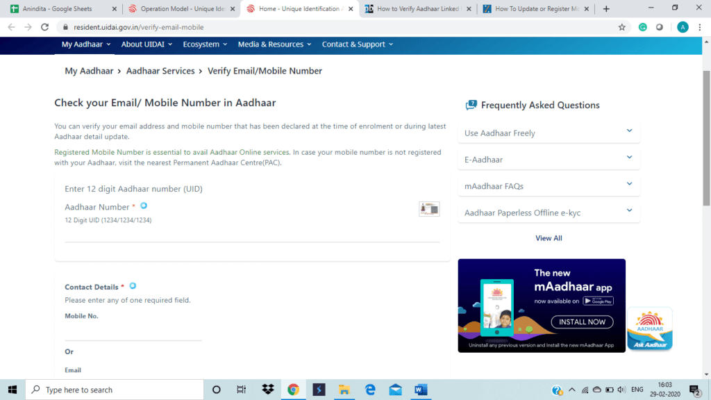 - Verify Email or Mobile Number: Aadhaar website enables you and the service providers verify if the Aadhaar number with your mobile or email address is valid and is not inactivated. Follow the below steps for this: