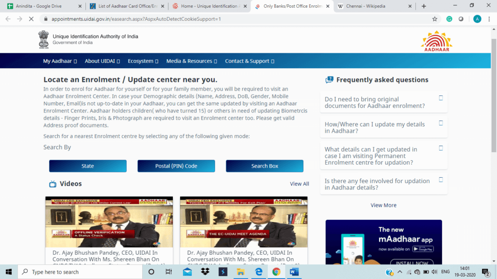 Below given are the list of permanent UIDAI authorized aadhaar centre in Chennai-Banks and Post Office: